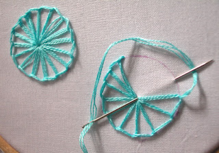 Para fazer este bordado use dois ou três fios de linha mouline na agulha. Trabalhando no sentido anti-horário, fazer um caseado partindo sempre do centro. Todos os pontos irradiam de um ponto central.